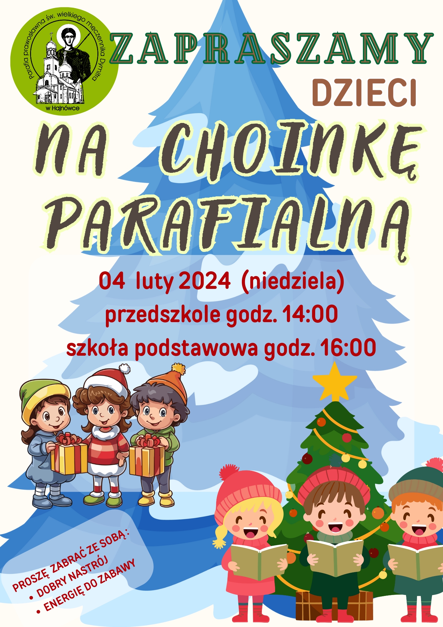 Serdecznie zapraszamy na zabawę choinkową, która odbędzie się w niedzielę 4 lutego w sali parafialnej. O godz. 14 spotkają się dzieci w wieku przedszkolnym, a o godzinie 16 dzieci uczęszczające do szkół podstawowych.