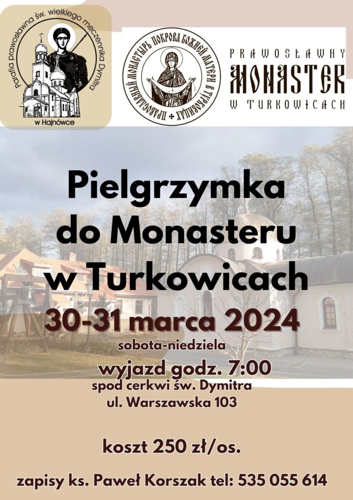 Serdecznie zapraszamy do udziału w autokarowej pielgrzymce do Monasteru Opieki Matki Bożej w Turkowicach. Wyjazd dnia 30 marca (sobota) o godz. 7:00, powrót w niedzielę 31 marca w godzinach wieczornych. Koszt pielgrzymki 250 zł za osobę (przejazd, ubezpieczenie, nocleg, wyżywienie). Zapisy pod numerem tel. 535055614 – ks. Paweł Korszak.